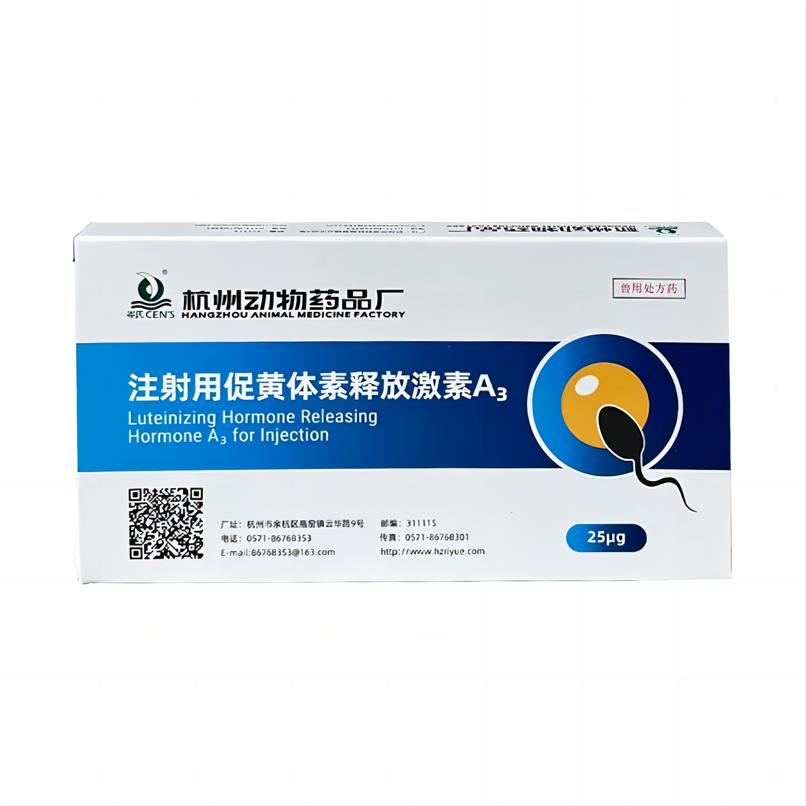 【药理作用】促黄体素释放激素A3属于激素类药。本品为人工合成的多肽激素,为丘脑下部释放的促黄体素释放激素的类似物,兼具有促黄体素和促卵泡素作用。能促使动物腺垂体释放促黄体素(LH)和促卵泡素(FSH),使血浆中LH浓度明显升高(FSH浓度轻度升高)促使卵巢的卵泡成熟而排卵。对雄性动物,可促进精子形成。不但可使垂体合成的激素立即释放,也能够刺激激素合成。对雄性动物,可促进精子形成。